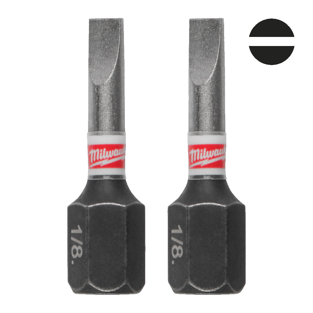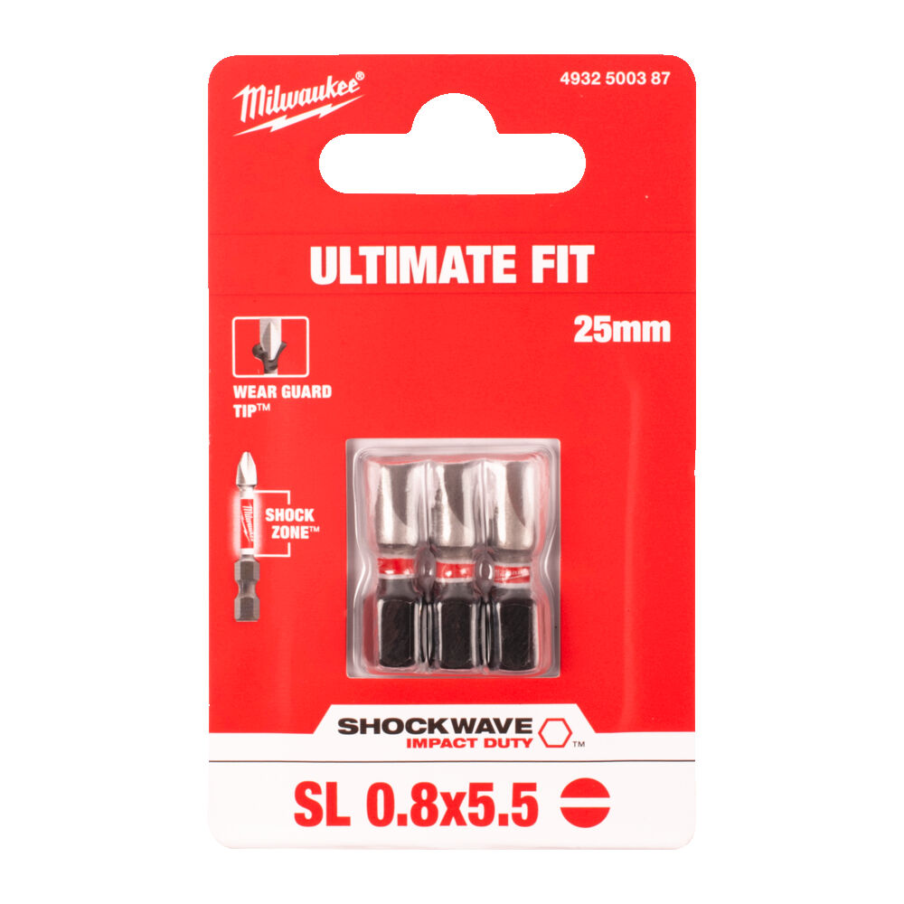 Μύτες βιδώματος SHOCKWAVE™ ίσιες MILWAUKEE® για βαριά χρήση με παλμικά κατσαβίδια, με WEAR GUARD TIP™ για μεγαλύτερη αντοχή στη φθορά, SHOCK ZONE™ για λιγότερα σπασίματα και ειδικό θερμικά επεξεργασμένο χάλυβα για υψηλή ανθεκτικότητα.